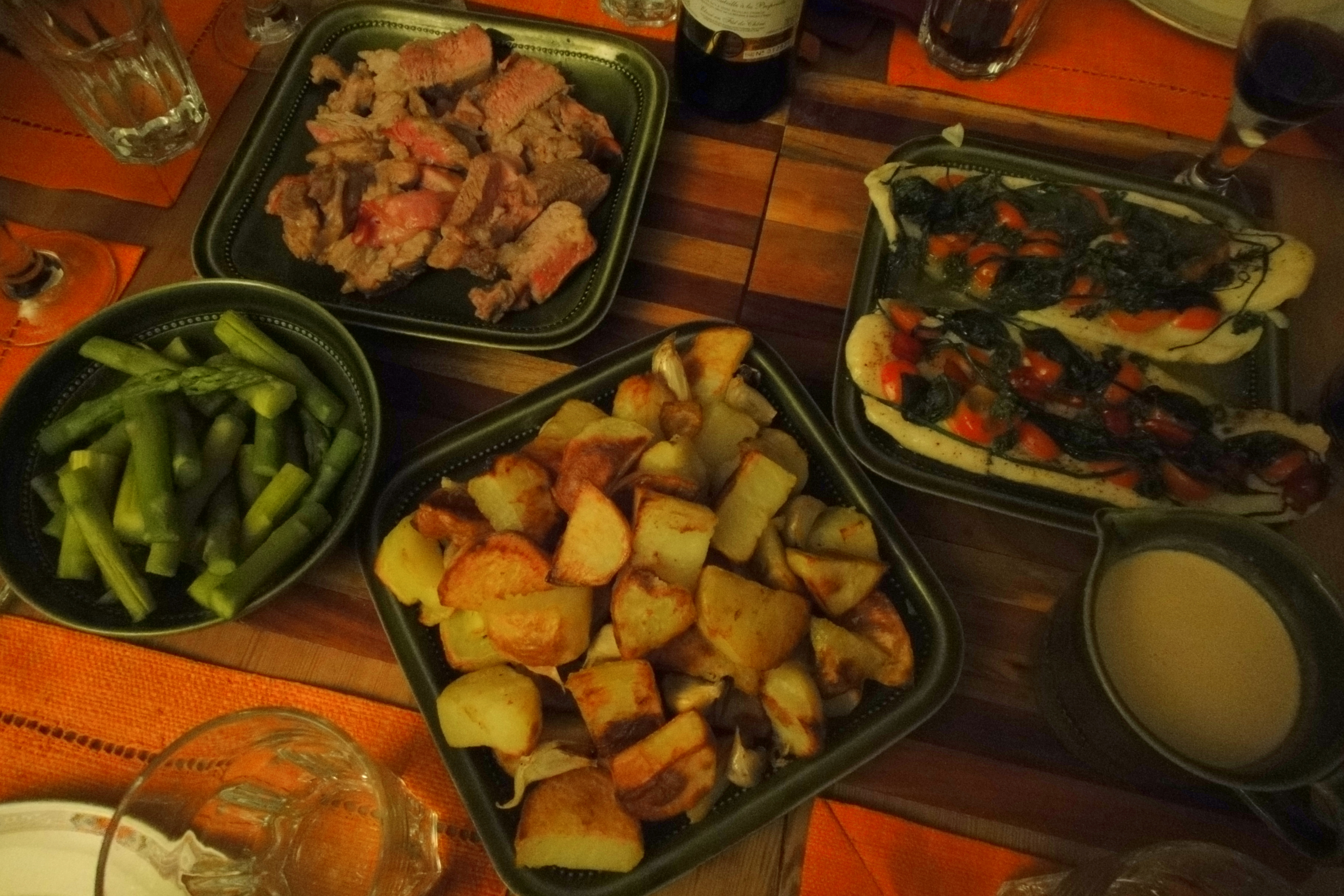Then the piece de resistance – a delicious main prepared entirely by the Froggy – roast veal with comte & bacon, oven baked fish with tomato & herbs, roast potatoes & steamed asparagus…