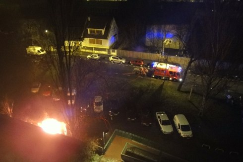 Unfortunately the evening was punctuated by an event that made me feel sick in the stomach. Towards the end of the main, we heard an explosion and felt a slight tremor in the building. Initially we thought someone had let off a random firework in too close to the building. Subsequent rubber-necking over the balcony revealed that we were partly right. It was a firework that had been let off… in conjunction with a molotov cocktail… in a beautiful Mercedes in the parking lot downstairs from my apartment. Fortunately our guests brand new car was parked 2 cars away and escaped any damage.